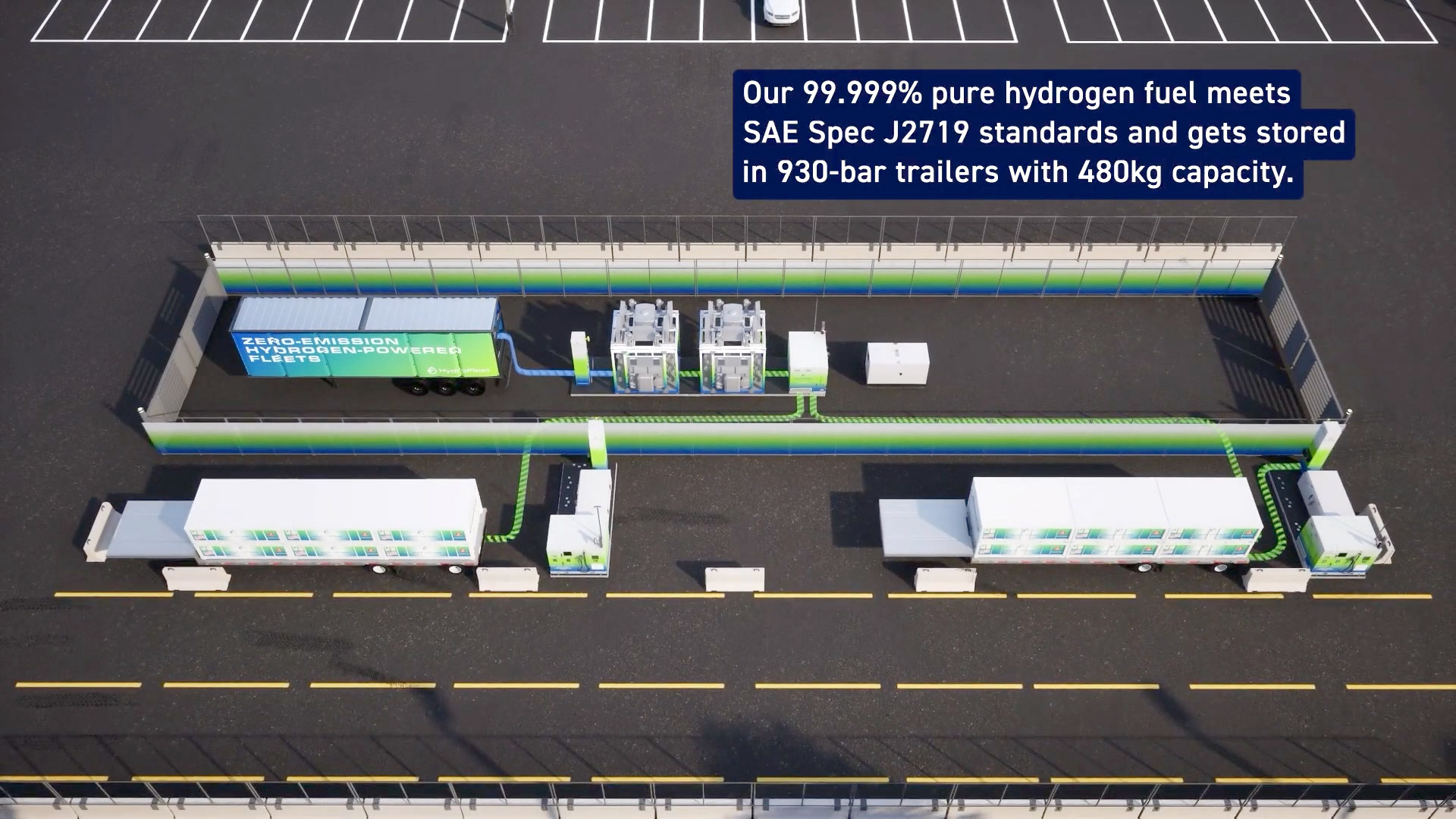The animation guides viewers through a realistic hydrogen fueling scenario involving a Class 8 truck entering a HydroFleet fueling location.